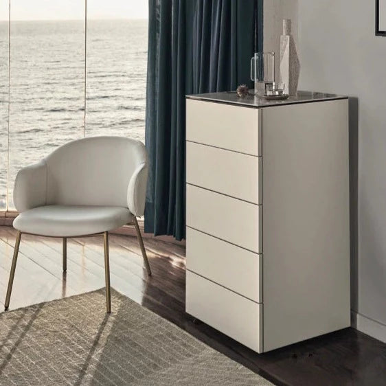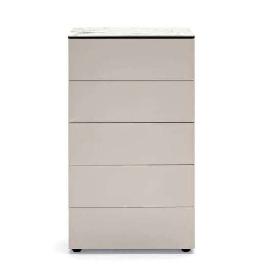 El sistema UNIVERSAL también está disponible en la colección de muebles de cajones para el dormitorio. Mesitas de noche, cómodas y semanarios al servicio de la cama y el espacio de descanso que cambian de aspecto al variar los acabados y el diseño de los frentes lacado.